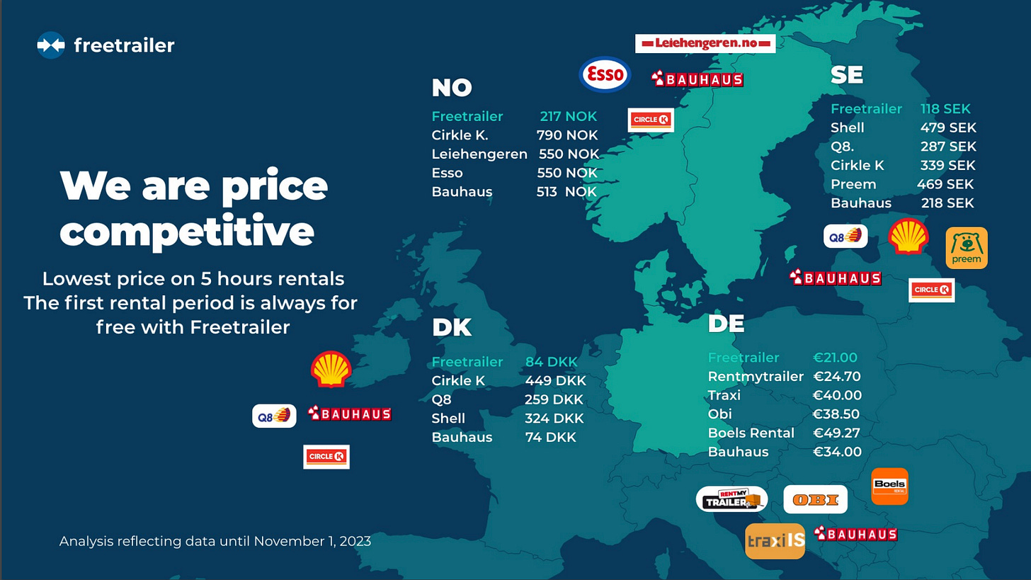 Freetrailer is not the cheapest option in Denmark, yet it holds a 60% market share, demonstrating that the service provides value beyond just low pricing. The convenience of picking up a trailer precisely where you need it and the simplicity of booking make it highly attractive to customers. This is a significant strength for the company because they are not only competing with pricing.