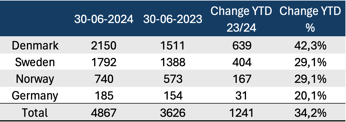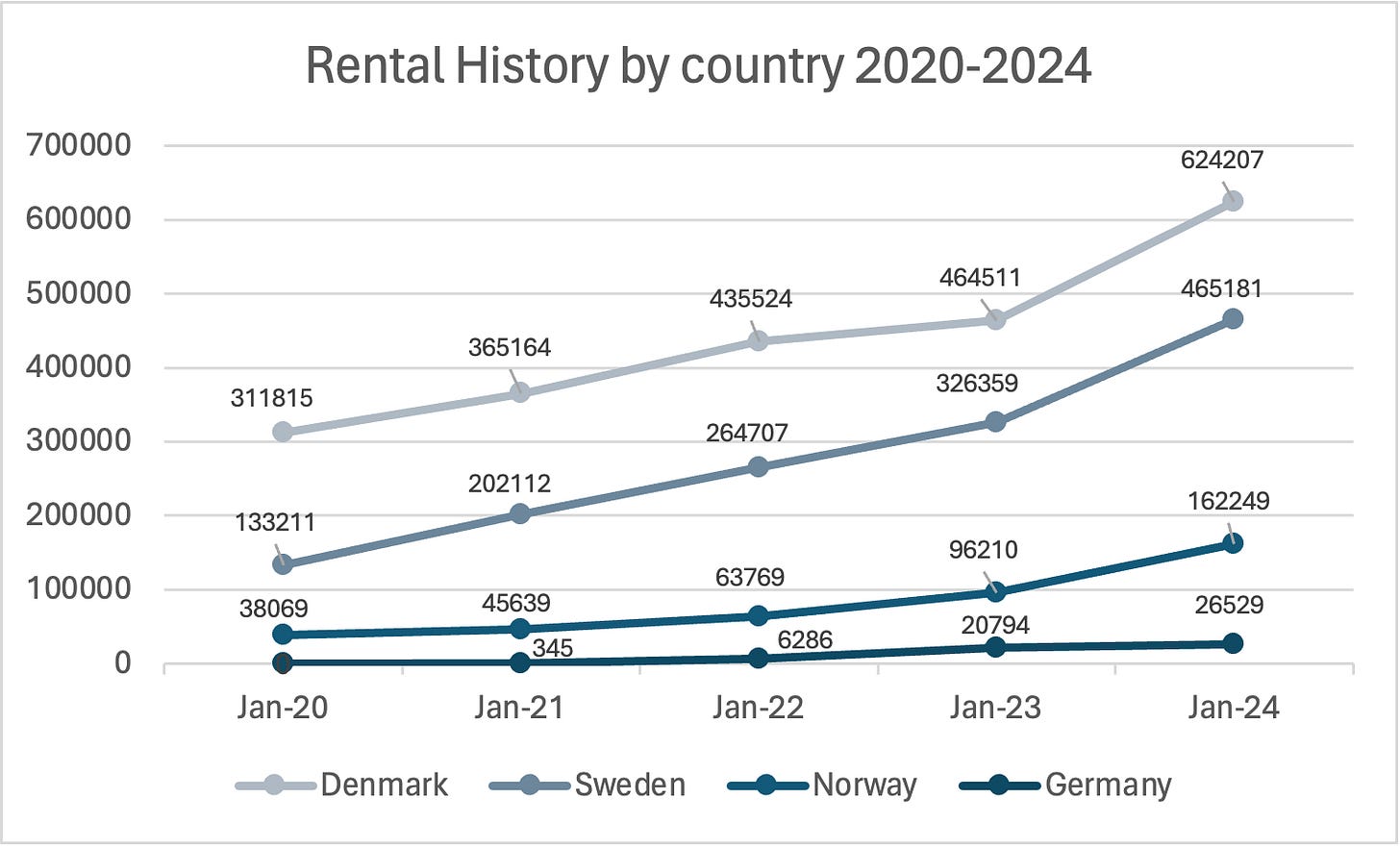 Near-Monopoly Market Position in Scandinavia: They are the first company in Europe and possibly the world that is operating a sharing economy model for trailers which on average makes their rentals four times cheaper for the consumer renting trailers the conventional way. They have a 60% market share in Denmark with 625 000 rentals for the last 12 month as of June 31 2024. In total 465 000 rentals in Sweden and 162 000 in Norway. Germany is a much less mature market and they are not as established there as they have in Scandinavia, in total they had 26 000 rentals in Germany. Their rentals have grown every year in every region from 2020.