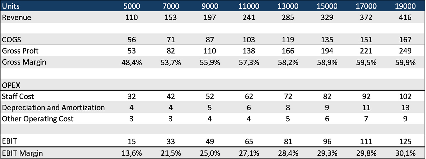 It’s impossible to forecast their exact expenses and revenue per unit in the future, but the table below provides insight into how their business model works and how margins expand as revenue increases. I have made the following assumptions: i) Fixed costs are 15M DKK and leasing cost per trailer is 7990 DKK per year, ii) revenue per unit stays at 21,900 DKK per unit, iii) staff costs increase by 10M DKK every year, and iv) D&A and other operating costs increase by 20% annually. All numbers are in millions, except for the units.
