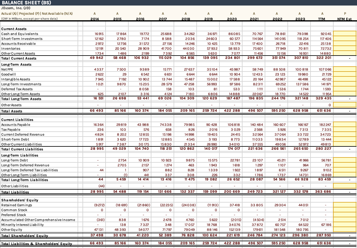 Cash and Equivalents is rising which is good. Cash per share in US dollars (including short-term investments) is $21.11 compared to the share price today which is trading at $26.24. Net cash position after accounting for all debt is $10.88 per share. Parallel rise in inventory and net income. There are no surprises here either. Current ratio is over 1 which means they will meet their short-term obligations without any problems. PP&E is financed internally without the need of debt. Goodwill is not increasing massively which indicate that they don’t make many acquisitions and is focusing on their core businesses. JD would be able to pay off all their debt with their cash, equivalents and short-term investments or with 2 years of earnings. Debt to equity is 0.4. Retained earnings are piling up which is good. They have not issued any common or preferred stocks and they have begun purchasing back shares in accordance with their share repurchase program. The company may repurchase up to US$5.0 billion worth of its shares (including ADSs) over the next 36 months through the end of August 2027. The balance sheet is very healthy and there are no signs of financial problems. What I find most interesting regarding JD’s balance sheet is their net present value and liquidation value which is very close to the share price. Cash, equivalents and short term investment totaled $28.8 billion as of June 30, 2024. Account receivables is $2.978 billion, Inventory is $9.721 billion, other current assets is $1.916 Billion, PP&E is $10.758 billion, Land is $5.289, Equity Investments is $7.572 billion and Long-term investments is $11.964 Billion. The value of the aforementioned is in total $78.998 billion. After subtracting total liabilities which is $50.044, we get $28.954 Billion in net asset value which equals $18.80 per share or 72% of the current share price ($26.24). The idea is not to hope that JD will liquidate all their assets and stop operating, but rather get an insight to how big the margin of safety is. Free cash flow as of June 30, 2024 for TTM is $7.656 Billion which is $4.97 per share. Assuming that the free cash flow will not grow in the future it would take you 1.5 years to get back your investment in assets (excluding intangible assets and goodwill etc) and free cash flow. (Share price - Net Asset Value) / FCF = ($26.24 - $18.80 = $7.44 ⇒ $7.44 / $4.97 = 1.50). If we account for a discount rate of 10% (WACC) it would take just under 2 years.