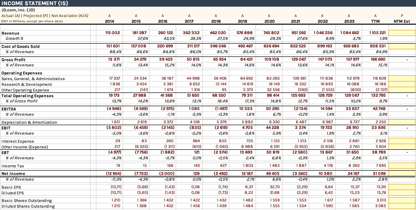 Gross margin: I mentioned in my first post “Introduction to Value Investing“ that a gross margin under 20% may be a indicator that the market is saturated and competitive. In this situation that is not the case. Most of JD’s revenue comes from selling goods directly to consumers which is more costly than connecting suppliers with customers similar to competition like Temu. JD have to have their own warehouses where they store inventory and a logistic network to ship them. Even though it is more expensive, it gives them more operational control over product quality and shipping time. The trends shows that JD is able to decrease the Cost of Goods Sold effectively. In summary, JD operates a capital heavy business model and as a consequence they operate on thinner margins than their competition. It lies within their strategy to be able to offer better product quality than competitors and faster shipping times.