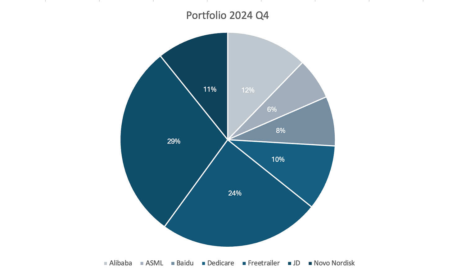 The portfolio has a large exposure to Chinese companies. Chinese stocks today offer some of the best value in the market. Many of these companies have strong fundamentals, but their share prices don’t reflect their full potential. I believe this creates a rare opportunity. Novo Nordisk dropped -20% today and I saw that as a fantastic opportunity to buy a few shares, I will publish an analysis the upcoming week. Dedicare is still showing signs of weakness but in the long-term I believe there’s a 100% upside which will likely be realised within 3 years.